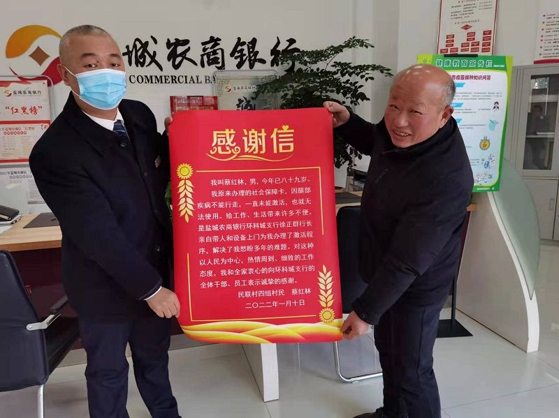 近期,盐城农商行环科城支行接到了客户张女士(化名)的电话,声称家中年近90高龄的老人社保卡需要激活,但老人年纪较大,且腿脚行动不便,无法到银行现场办理激活,希望银行工作人员能够给予帮助。听闻张女士的难处后,环科城支行工作人员立即承诺可以为客户提供上门服务,并主动约定了上门时间。次日,支行行长徐正群便与两名工作人员带着移动机具前往张女士父亲家,为老先生办理社保卡激活,并开通了短信通知,方便老先生及时掌握社保卡金融账户余额变动情况。半个多小时的上门服务,为张女士全家解决了这块“心病”,环科城支行的真诚服务获得客户的连连称赞“天气越来越冷, 我们这些上了岁数的人出行不方便,你们银行能大老远上门办理,可真是帮了我们大忙了!”老先生拉着徐行长的手激动地讲。