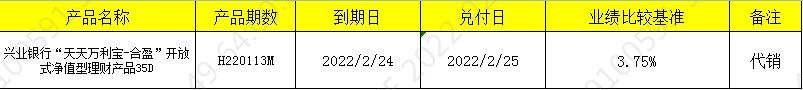 兴业银行“天天万利宝-合盈”开放式净值型理财产品35D H220113M 兑付公告代销